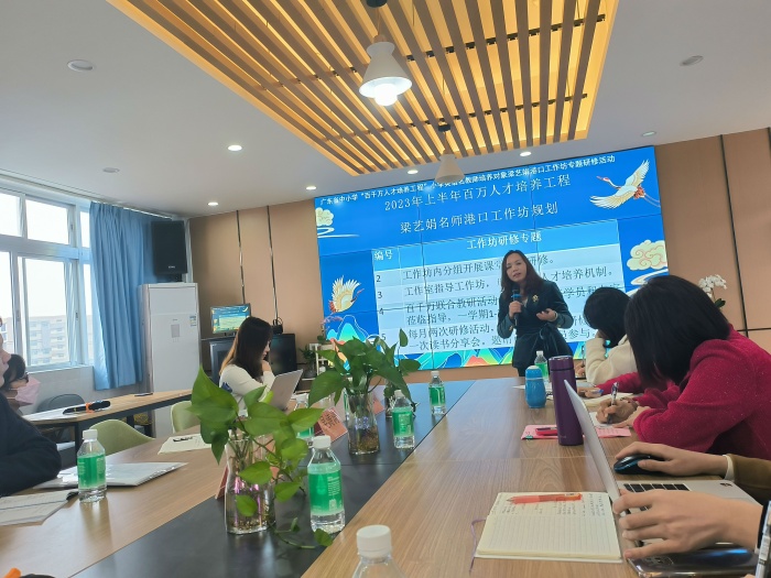 隨后,梁老師以《做師生成長路上的點燈人》的視頻對工作坊2022年的工作開展情況做了回顧總結。港口工作坊半年期間開展了14次研修活動,其中梁藝娟老師專題講座3場,讀書分享會2場,專家講座5場,線上研修9次。工作坊共邀請廣州市名師、河源市名師、中山市名教師、百千萬導師、高校專家共5人線上線下指導。通過專題研修,研讀學生,深耕課堂,不斷開拓堂課的高度、寬度和深度。半年間,9位成員取得了優異的成績,并以“我眼中的優秀成員”對每位成員的工作做了點評,給予真切的肯定和溫馨的鼓勵,讓會議氛圍充滿了暖暖的氣息和滿滿的正能量,為后期工作坊的發展與提升制定了目標和方向。梁老師鼓勵工作坊成員攜手共進,領跑未來,遇見更好的自己,做更美的教育。