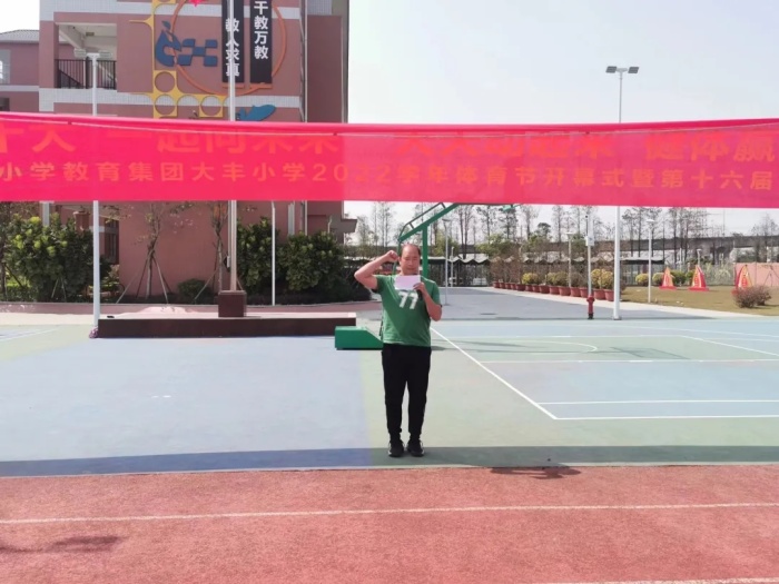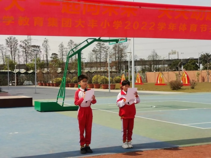 國歌奏唱完畢,黃艷冰校長對本次運動會作開幕式致辭。黃校長寄語全校師生,希望運動員們在比賽中要尊重裁判,遵守規則,賽出優異成績;希望裁判員們要公正執裁,高質高效圓滿完成賽事裁判;希望觀眾們要文明助威,文明觀賽。緊接著,運動員代表黃子涵同學和裁判員代表梁江帆老師進行了莊嚴的宣誓。在一片熱烈的歡呼聲中,黃校長宣布大豐小學第十六屆運動會正式開幕。