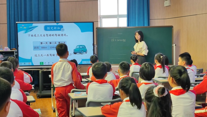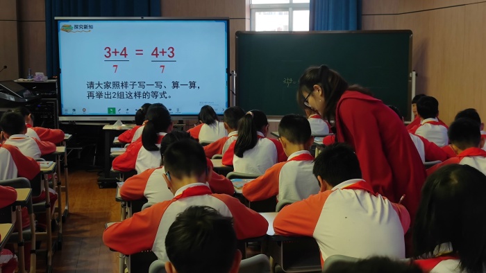 活動伊始,科組長吳芬老師和梁綺欣老師分別執教了《加法交換律和乘法交換律》《加法結合律》兩節新授課。吳老師用生動有趣的“朝三暮四”成語故事引入情境教學,通過猜想、驗證、推理、遷移,讓學生經歷加法、乘法交換律的推理過程。通過舉證、對比、提煉,引導學生把運算定律進行形式化的表達,培養了學生的抽象能力和模型思想。梁老師則是用“三國爭天下”、“旅游好物分享”等形象比喻開啟了加法結合律的遷移學習。梁老師整節課的設計讓學生從數學的角度去獲取信息、提出問題,用所學的知識解決問題;通過促進學習的遷移,幫助學生將原來零散的感性認識上升為理性認識。從根本上改變學生認為“計算枯燥”的錯誤印象。