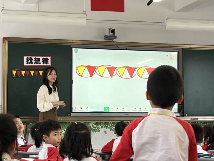 活動伊始,大豐小學青年教師吳雁琪老師首先為大家呈上了一節(jié)一年級《找規(guī)律》的精彩課例。吳老師整節(jié)課的設(shè)計,基于探究單的前置性學習,通過生生互動,以達讓學生在數(shù)學課堂上“像數(shù)學家一樣探究”的學習效果。吳老師先是利用前置探究單學習,激發(fā)學生探究的欲望。再通過說一說、找一找、擺一擺、畫一畫和圈一圈等體驗活動,讓學生積累活動經(jīng)驗的同時,力求體現(xiàn)新課程標準精神。這節(jié)課吳老師設(shè)計了貼近生活且富有趣味性的活動,讓學生在趣味中欣賞、觀察、猜想、驗證,在美的感受中學習有趣的數(shù)學,給予學生從直觀到抽象、從具體到概括地逐步發(fā)展的空間。
