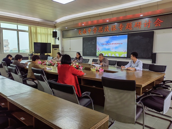 為進一步加強學校思政課教師隊伍建設和思政課程建設,提高思政課育人實效,3月29日下午,大南中學在四樓榮譽室召開學校思政課專題研討會。學校黨支部書記、副校長廖建紅,副校長謝錦新,教學處主任唐旭華,教學處副主任吳權明,以及學校全體思政教師參加了會議。