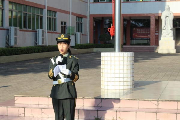 接著,國旗護衛隊老隊員代表黃嘉漩同學發言。她說把這面鮮紅的國旗交給下一屆國旗護衛隊隊員們,縱然有不舍,但相信新隊員們會把守護國旗的精神傳承下去,相信他們以后每一次升旗都會不斷超越。新隊員代表梁凱穎同學也代表全體隊員表決心,全體新隊員在國旗下鄭重宣誓,他們會滿懷愛國心,像愛護自己的生命一樣愛護國旗,認真履行國旗護衛隊職責,高質量完成各項任務。