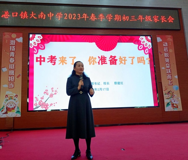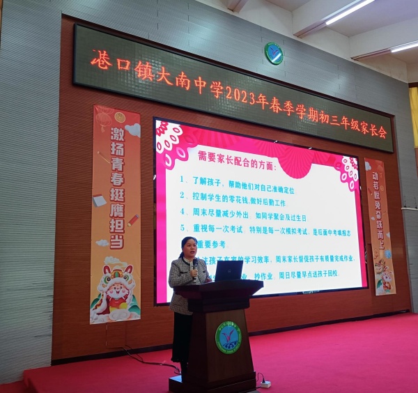 為加強(qiáng)家校聯(lián)系,形成教育合力,2023年2月17日下午,港口鎮(zhèn)大南中學(xué)邀請畢業(yè)班學(xué)生家長齊聚校園,召開以“家校同心·師生同行”為主題的家庭教育培訓(xùn)暨畢業(yè)班家長會。會議由德育處副主任孫欣欣主持。
