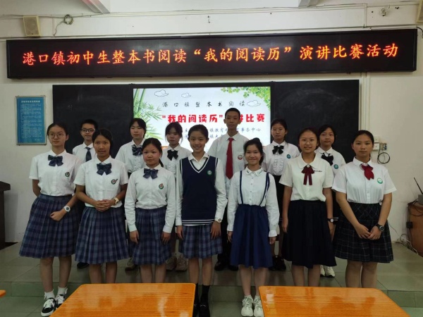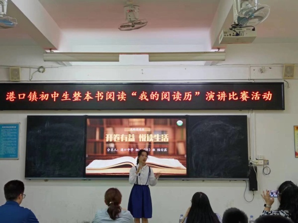 為引導(dǎo)中小學(xué)生開闊視野,提高人文素養(yǎng),多讀書,讀好書,展示讀書成果,4月14日下午,“港口鎮(zhèn)初中整本書悅讀活動”之“我的閱讀歷”主題演講比賽在港口鎮(zhèn)大南中學(xué)一樓多媒體室舉行。