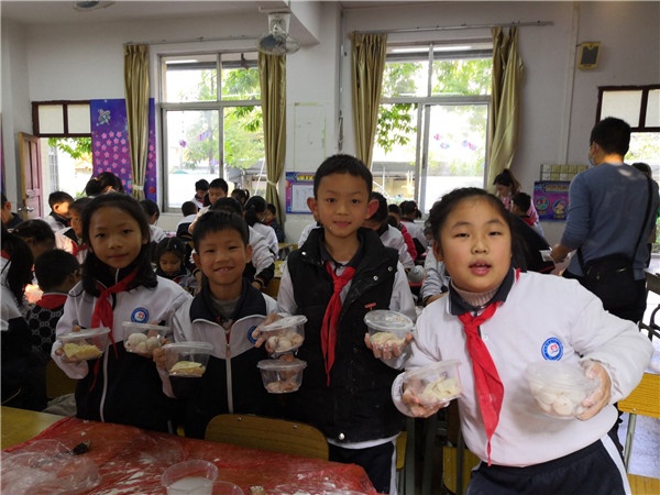 在搓湯圓活動中,師生們鋪好桌子,分好材料,挽起袖子,戴上手套,同學們的臉上洋溢著躍躍欲試的興奮。紛紛學著老師的動作,先在手上抹點面粉,然后再掐一塊糯米粉團,把它壓成一片,再在中間用手指弄一個窩窩,里面放上調好的餡料,外面再用糯米粉揉成一個“小球”,一個胖乎乎、圓滾滾的湯圓就做好了。“我成功啦!”孩子們紛紛拿出自己的包好的湯圓向老師和同伴炫耀著,紅彤彤的臉上洋溢著比湯圓還甜的笑容。