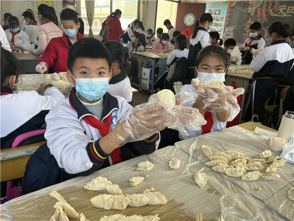 在“包餃子”活動上,同學們用手指靈活地捏動,在餃子皮上捏出排列有序的花紋,整整齊齊地擺在托盤里。不太會包餃子的同學,笨拙地擺弄著餃子皮,但也頻頻走下位置向別的同學虛心求教。孩子們拿著自己親手制作出的餃子,內心里充滿了收獲的歡喜,校園里歡聲笑語不斷。