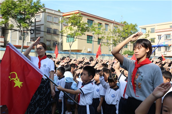 根據(jù)中山市團委、市少工委的統(tǒng)一部署,10月11日,莊嚴而神圣的升旗儀式上,大隊輔導(dǎo)員余老師帶領(lǐng)全體隊員再次認識了黨旗、團旗和隊旗,引導(dǎo)隊員要規(guī)范少先隊禮儀,敬標準的隊禮,正確佩戴紅領(lǐng)巾等,并帶領(lǐng)隊員們面向黨旗、團旗和隊旗,開展“四個一”活動,即敬一個隊禮,唱一次隊歌,重溫一次入隊誓詞,進行一次呼號。