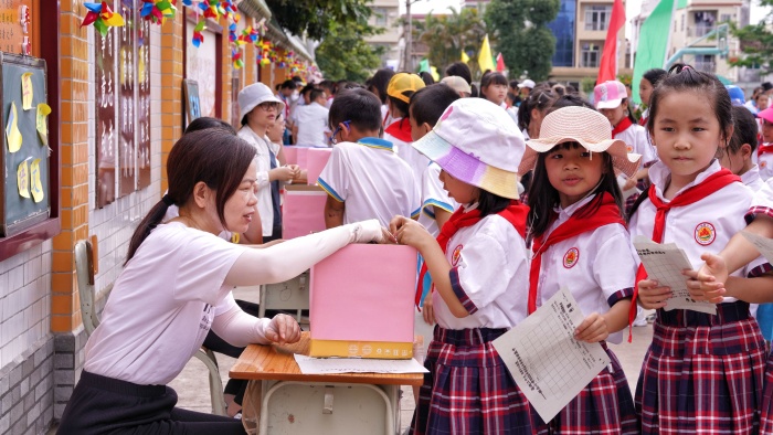 早上,群眾小學舉行了“喜迎二十大 爭做好隊員”活動。梁銓華校長向全校少年兒童送上節日祝福。在學校雛鷹合唱團的帶領下,全校師生共同唱響《我們健康快樂成長》以及《一起向未來》。緊接著,六(3)班少先隊員李青璇帶來一曲歡快的古箏獨奏。表演結束后,群眾社區陳淑媚委員和吳芳委員親自給孩子們送上節日禮物。