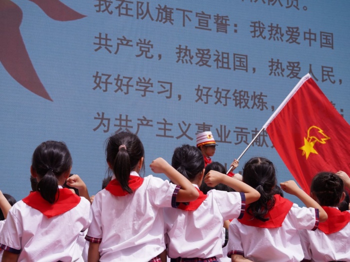 這一天對于一年級的同學們來說是個特別的日子。因為在這天,又有一批新的少先隊員加入到中國少年先鋒隊的行列。高年級的哥哥姐姐們作為隊員,為一年級的新隊員們佩戴了鮮艷的紅領巾。新隊員們在鮮艷紅領巾的映襯下,綻放出甜甜的微笑。