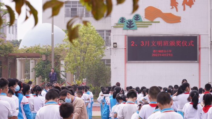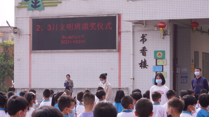 2022月4月21日上午大課間,群眾小學少先隊少工委舉行二、三月份“爭創文明班”小結頒獎活動。
