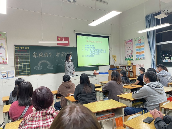 專題講座結束后,各年級家長走進各班教室,與學科老師開展交流活動。首先,班主任們向家長介紹學生在學校的學習、活動情況,展示學生的過程性評價、優秀作業,班級所獲得成績、榮譽等,讓家長真切地了解到孩子們的在校情況。同時與家長交流“雙減”政策的內涵、實質,就“雙減”背景下如何開展家校共育問題,展開交流與討論。各科任老師也相互進入到自己所任教的班級,就自己所任教的學科,向家長匯報自己教學時學生的表現,并對學生家長提出切實可行的學習建議。也有不少的班級邀請了優秀家長,與其他家長分享了自己家庭教育的一些經驗與心得還有育兒路上的困惑……