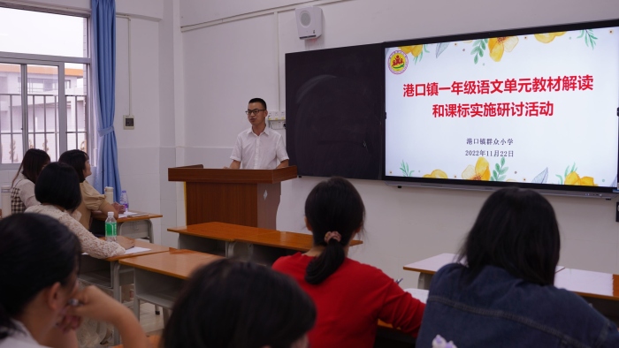 為加強小學語文教師對統編教材的深度解讀,探討單元整體視野下的教學策略,提高課堂教學實效,推動學生深度學習,促進教師專業素養發展,11月22日下午,港口鎮群眾小學承辦了小學語文一年級單元教材解讀活動。港口鎮教育和體育事務中心專干蘇彩南老師、鎮語文中心教研組組長吳高欣主任、鎮內兄弟學校的一年級語文任課老師及群眾小學語文科組全體老師參與了此次活動。
