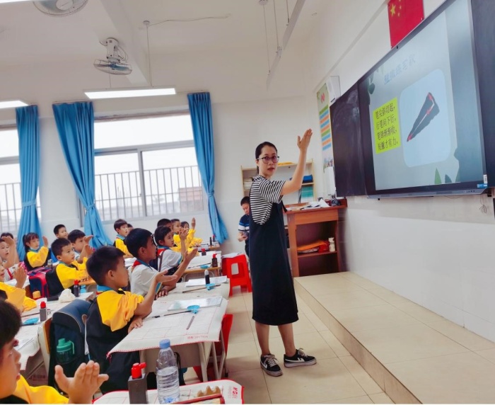 漢字筆畫的形態(tài)變化對(duì)于小學(xué)生來說是一大難點(diǎn)。但是何老師化繁為簡,先用手勢操深入淺出地引導(dǎo)同學(xué)們理解短撇的形態(tài),再通過“永字八法”小視頻里的“短撇為啄”引導(dǎo)大家感受短撇的力量感。