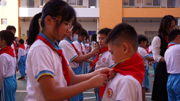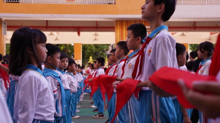 在鮮艷的隊旗下、嘹亮的歌聲中,入隊儀式順利拉開帷幕。首先,大隊輔導員莫少欣老師宣讀入隊隊員名單,共236名新隊員。接著,五年級隊員為新隊員佩戴紅領巾后,大隊委陳思蘊帶領少先隊員在隊旗下宣誓。全體隊員面向鮮紅的隊旗,莊嚴宣誓:挺拔的站姿,鏗鏘的誓詞。一聲聲誓言堅定有力,彰顯著新隊員的理想與信念,代表著新隊員的責任與擔當。