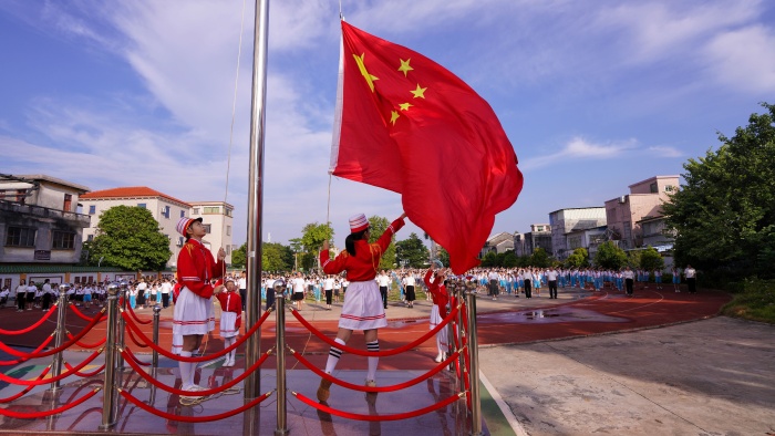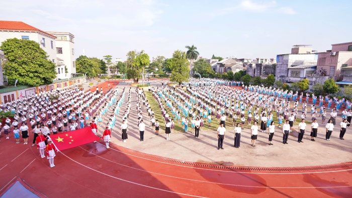 首先,全體師生進行莊嚴的升旗儀式,共唱國歌。