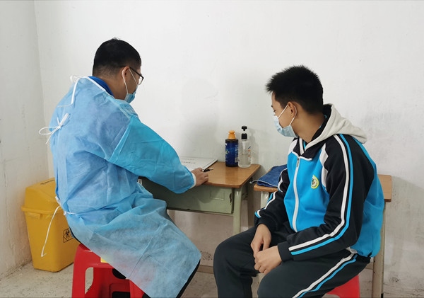 演練正式開始。蘇校長(zhǎng)接到衛(wèi)健部門通知,校內(nèi)有一名學(xué)生是新冠肺炎疫情病例的密切接觸者。接著,她立刻通知信息聯(lián)絡(luò)小組核查該生的具體信息。核實(shí)信息后,蘇校長(zhǎng)立即組織各管理工作成員召開封閉管理工作組會(huì)議,啟動(dòng)應(yīng)急預(yù)案,部署處置工作。楊瓊威老師立刻廣播通知全校師生停止一切集體活動(dòng),做好個(gè)人防護(hù)。保健教師陳國(guó)文老師做好個(gè)人防護(hù)后,立刻轉(zhuǎn)送該密接者到留觀室隔離,初步了解其最近14天的校內(nèi)活動(dòng)軌跡,并把情況告知學(xué)校疫情防控領(lǐng)導(dǎo)組。同時(shí),協(xié)助“三人小組”轉(zhuǎn)運(yùn)該生到定點(diǎn)機(jī)構(gòu)隔離觀察。隨后,學(xué)校根據(jù)疾控中心要求,將密接者所在班級(jí)、任課老師轉(zhuǎn)移至備用課室。消毒防疫組人員立即對(duì)校內(nèi)所有的活動(dòng)場(chǎng)所進(jìn)行全面消毒工作。最后,蘇校長(zhǎng)向上級(jí)部門匯報(bào)應(yīng)急防控進(jìn)程。