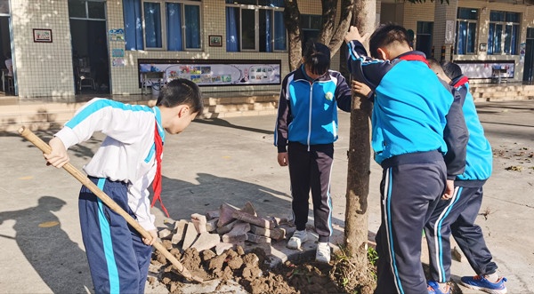 植樹節當天下午,蘇少麗校長帶領少先隊員們在校園進行播種“新綠”植樹活動。活動中,同學們熱情高漲,干勁十足。他們揮锨刨土,扶苗澆水……在大家的共同努力下,一棵棵樹苗昂然挺立在陽光下,煥發出蓬勃生機,為校園增添了一片綠色風景。