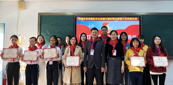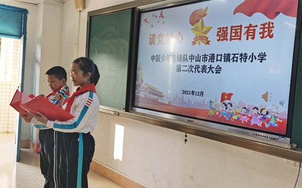 顆顆童心凝聚在一起,星星火炬閃耀著光芒,在中國共產黨的帶領下,中國少年先鋒隊走過了72年的光輝歷程。為深入貫徹落實習近平總書記關于少年兒童和少先隊工作的重要指示精神,推動黨建帶隊建機制,增強少先隊員的光榮感,12月9日下午,中國少年先鋒隊中山市港口鎮石特小學第二次代表大會勝利召開。港口鎮團委書記、港口鎮少工委主任李冠良、港口鎮少工委副主任夏榮、學校少工委領導、家委會代表、輔導員代表和少先隊員代表共同參加大會。