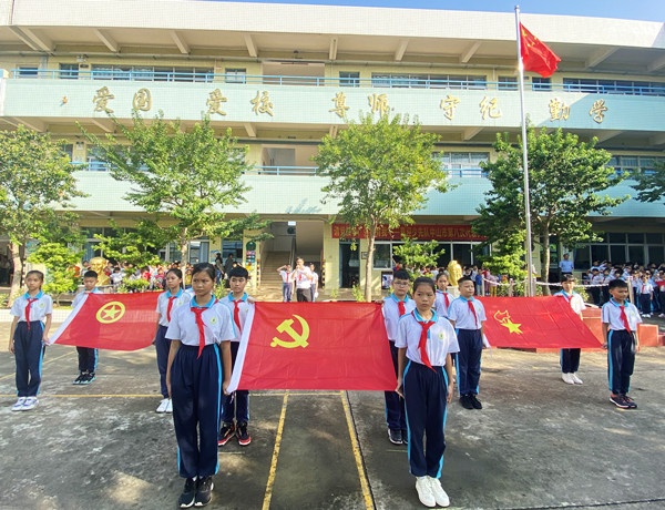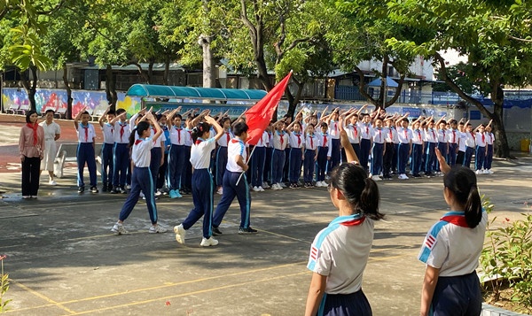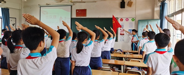 11日上午,升旗儀式后,全校舉行了少先隊微儀式。護旗手們舉著中國少年先鋒隊隊旗,邁著堅定整齊的步伐進場。神采奕奕的少先隊員們面向著隊旗敬禮,心里的尊敬與自豪不言而喻。隊員們在六(2)中隊黎冰同學的指揮下,認真地唱著隊歌。緊接著,全體少先隊員重溫了入隊誓詞,高亢嘹亮的宣誓聲,響徹校園,表達了新時代少先隊員的壯志豪情。學校少工委主任梁容根同志也為全體少先隊員送上了寄語,希望每一位隊員要以實現中華民族偉大復興為己任,不負黨和人民的殷切期望。最后,大隊輔導員帶領著全體隊員莊嚴呼號。