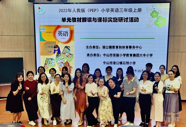 為不斷提升小學英語教師整體把握新課程標準,落實學科核心素養,深度解讀教材,整合單元教材資源,促進教師專業發展。2022年10月27日,在中山市港口鎮教育和體育事務中心的高度統籌下,中山市港口鎮石特小學英語科組聯合兄弟學校中山市實驗小學教育集團大豐小學英語科組共同承辦2022年人教版(PEP)小學英語三年級上冊第三單元教材解讀與課標實施研討活動。港口鎮教育和體育事務中心教研專干吳濤濤老師、港口鎮小學英語中心教研組組長蔡東琳老師蒞臨指導,各兄弟學校的英語老師參加了本次活動。