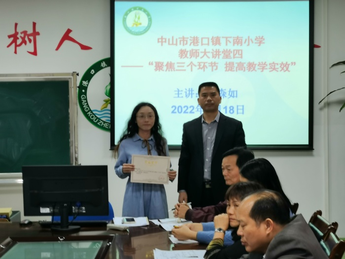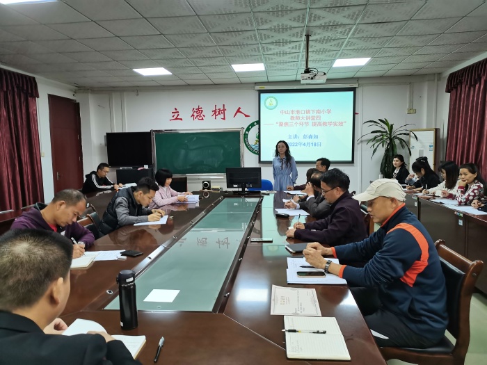 2022年4月18日下午,在港口鎮下南小學每周教師例會中,進行了以“聚焦三個環節,提高教學實效”為主題的講座。學校管德豐校長、陳宇環副校長、教務處高主任、德育處梁主任和辦公室何主任出席了本次講座,學校部分教師也參與其中。