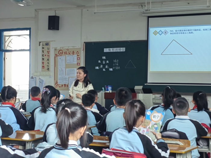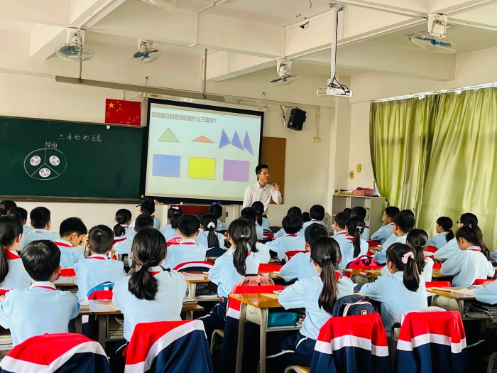 整個活動分五大環(huán)節(jié)進(jìn)行。首先是觀摩骨干教師林子健老師執(zhí)教的《三角形的特征》課例。在本堂課中,子健老師以“先學(xué)后教,當(dāng)堂訓(xùn)練”的教學(xué)模式貫穿整個教學(xué)環(huán)節(jié),旨在培養(yǎng)學(xué)生的自學(xué)能力和提高課堂效率。子健老師的循循善誘、層層遞進(jìn),逐步引導(dǎo)學(xué)生從已有的知識體系出發(fā),深入探索三角形的特征,引發(fā)學(xué)生的深思。學(xué)生全情投入,思考怎樣的圖形才是三角形,如何利用畫垂線的方法給三角形畫高,通過動腦思考、動手嘗試、小組討論的方式,學(xué)生一一攻破知識難點(diǎn),收獲滿滿。緊接著觀摩優(yōu)秀教師林偉健老師執(zhí)教的《三角形的分類》課例,偉健老師的課,從精準(zhǔn)把握學(xué)生的起點(diǎn)出發(fā),整節(jié)課環(huán)環(huán)相扣,逐步滲透分類的思想,引導(dǎo)學(xué)生探究三角形分類的標(biāo)準(zhǔn)是什么,從而掌握三角形的類型既可以按角分,也可以按邊分。本節(jié)課以小組討論為主,在激烈的討論中,學(xué)生彼此之間碰撞出思想的火花,大大提高了課堂效率。