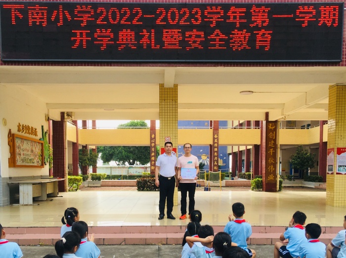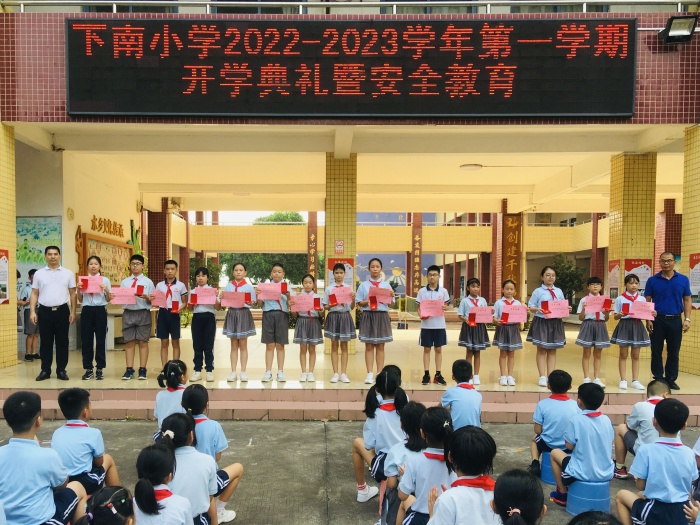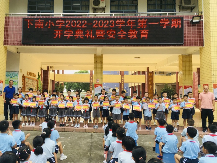 典禮的最后環節是頒獎環節,在熱烈的掌聲當中,下南小學的管德豐校長、梁廣平主任、梁漢輝主任為上學期各年級的學習標兵和獲得少先隊紅領巾三星章的同學、中山市優秀中隊輔導員陶嘉駿主任以及中山市優秀少先隊員黃曉彤同學等師生頒發獎狀和獎品,港口鎮下南小學2022-2023年度第一學期開學典禮暨安全教育也在充滿喜悅的氛圍下結束。