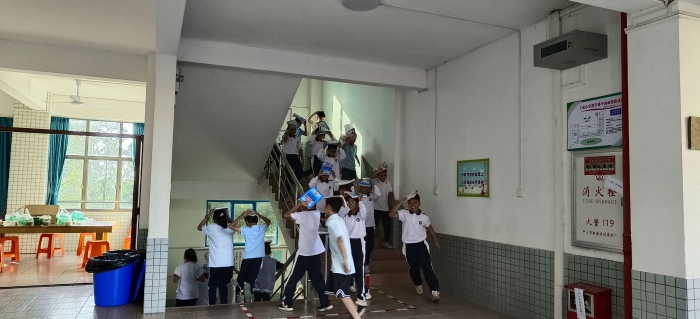 疏散到安全地方后,德育處梁廣平主任做了總結:表揚本次疏散全體師生能嚴格按照方案做好緊急疏散,都能拿著厚實物品遮擋頭部做好掩護,在疏散過程中有個別學生不慎摔倒能夠迅速爬起繼續撤離,有了較強的安全防護意識。