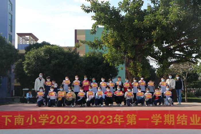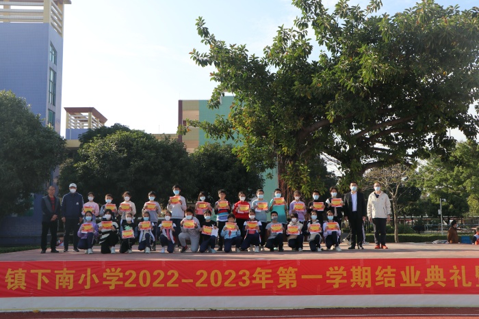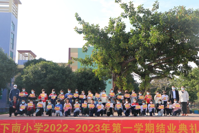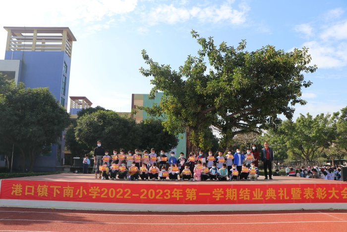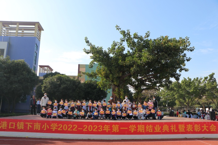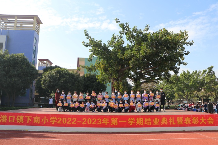 2023年1月6日下午,港口鎮下南小學在學校運動場舉行2022-2023學年第一學期結業典禮暨表彰大會,全校師生參與并邀請了法制安全教育黃慕華副校長參加。