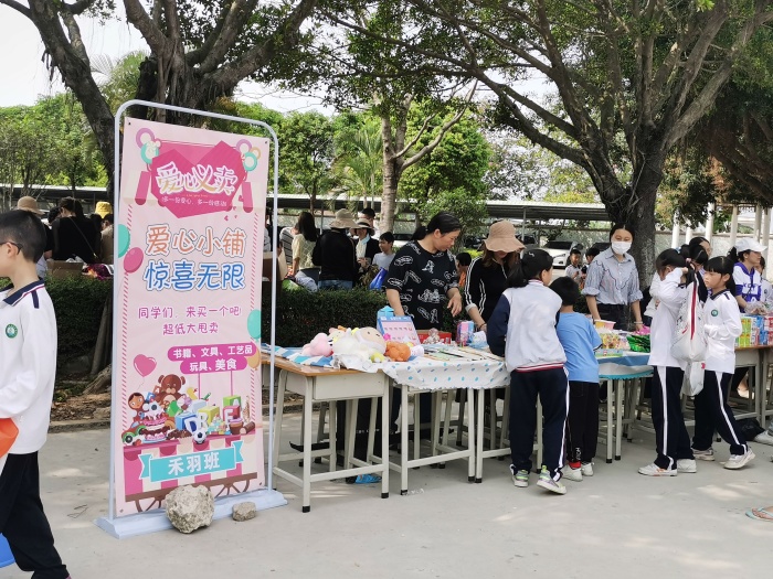 拍賣會結束后,義賣活動正式開始,全校師生和部分家長志愿者共同參與。各中隊積極籌備,學校教師、少先隊員都捐獻了許多物品到班級進行義賣,設計促銷標語、制作宣傳黑板,精心布置義賣攤位,采用各種方法吸引師生目光,攤位上商品琳瑯滿目、品類繁多、物美價廉。攤位除了書籍、文具、玩偶、玩具、手工創作等物品,還有家長們親手制作的瓜果沙律、蛋糕奶茶、燒烤小吃等參與義賣表達愛心。