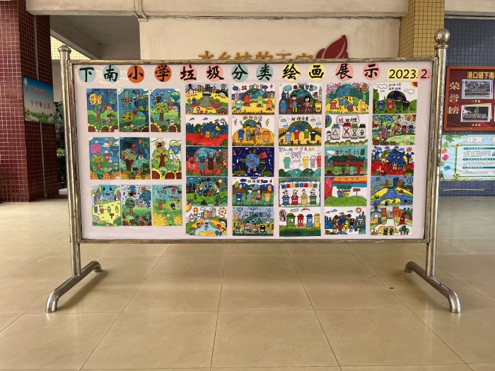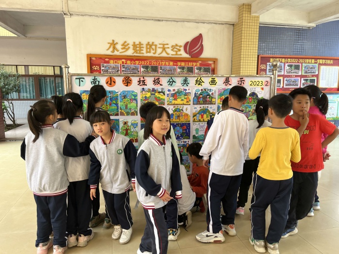 27日下午,下南小學德育組對三至六年級垃圾分類繪畫作品進行評比,每年級評出5名優秀作品并將作品展示在學校一樓大堂。一屏主題鮮明、色彩鮮艷的垃圾分類繪畫作品展示欄,引得眾多學生前來細細觀賞,相互交流自己了解到的垃圾分類和環保知識。這些繪畫作品中童心童趣的畫面和突出的主題思想讓參與繪畫的學生懂得了垃圾分類的意義,也增強了其他學生保護綠色、低碳再利用的環保意識。