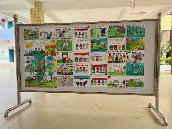 三至六年級的同學們利用美術課拿起畫筆,將自己對環保的熱情、對綠水青山藍天白云的喜愛和正確垃圾分類的意識以斑斕的色彩描繪于畫紙之上。