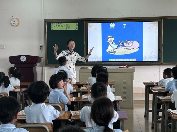首先,作為傳統(tǒng)文化吟誦實(shí)驗(yàn)學(xué)校,西街小學(xué)的語文科組的馮怡老師呈現(xiàn)了一節(jié)傳統(tǒng)文化專門課《弟子規(guī)·信(節(jié)選)》。馮老師通過形式豐富的朗讀讓孩子們在輕松愉悅的氛圍中感受傳統(tǒng)文化的內(nèi)蘊(yùn),通過聯(lián)系生活實(shí)際讓孩子們理解文意,從而規(guī)范自己的行為,達(dá)到學(xué)以致用的教學(xué)效果。