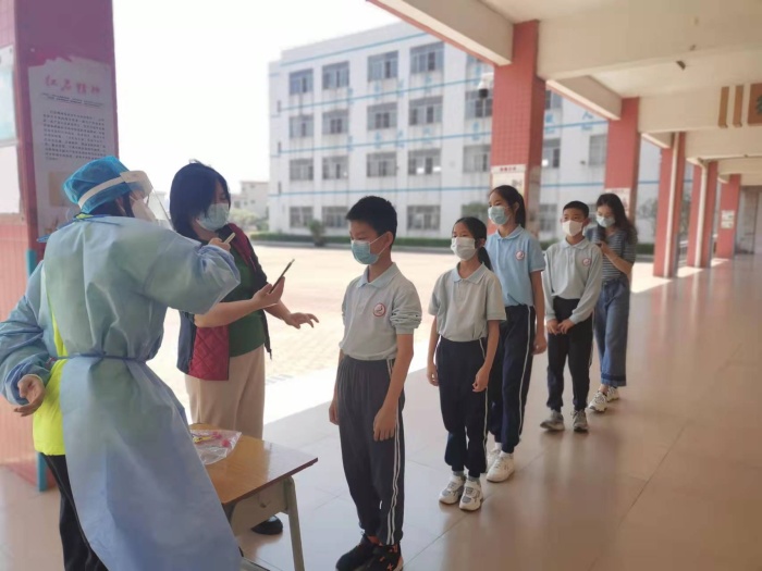 在模擬情景中,梁校長(zhǎng)接到衛(wèi)健部門(mén)通知,校內(nèi)有一名學(xué)生是新冠肺炎疫情病例的密切接觸者。接到通知后,學(xué)校立即召開(kāi)疫情防控工作會(huì)議,啟動(dòng)應(yīng)急預(yù)案,部署處置工作,校園實(shí)施封閉管理。相關(guān)負(fù)責(zé)人廣播通知全校師生停止一切集體活動(dòng),做好個(gè)人防護(hù),相關(guān)班主任核實(shí)學(xué)生信息,立刻聯(lián)系家長(zhǎng),對(duì)學(xué)生的流行病學(xué)史進(jìn)行調(diào)查,衛(wèi)生員陳輝燕老師將密接者轉(zhuǎn)移到隔離室,協(xié)助“三人小組”轉(zhuǎn)運(yùn)該生到定點(diǎn)機(jī)構(gòu)隔離觀察,密接者所在班級(jí)學(xué)生及老師轉(zhuǎn)移到備用課室,由清潔人員將校內(nèi)活動(dòng)場(chǎng)所進(jìn)行全面消毒。同時(shí)在上級(jí)指導(dǎo)下開(kāi)展排查工作及組織師生核酸檢測(cè)。演練結(jié)束后,梁麗鴻副校長(zhǎng)做了活動(dòng)總結(jié),她要求所有人員要認(rèn)真、嚴(yán)肅對(duì)待每一次演練,本著為每一位學(xué)生負(fù)責(zé)的原則,緊繃疫情防控這根“弦”,為師生的安全筑起堅(jiān)固的堡壘。