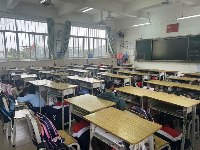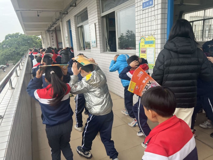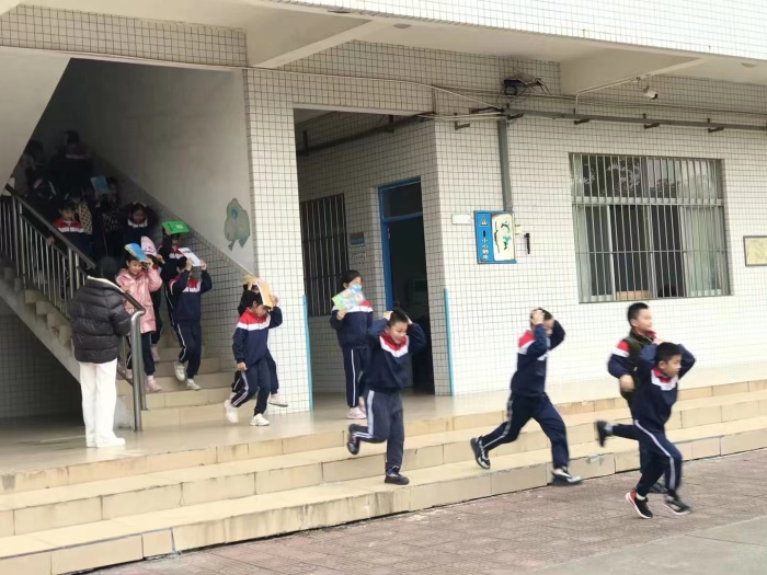 上午8點25分,警示鈴響徹在校園各個角落,所有師生瞬間進(jìn)入警備狀態(tài)。老師們教授的防震小知識,學(xué)生們都能學(xué)以致用,迅速拿出書包或書本放在頭頂,并鉆入桌子底下進(jìn)行室內(nèi)避震演練。