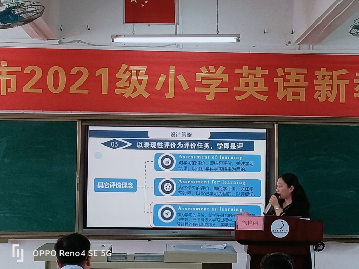 接著,中山市小學英語名教師工作室主持人徐艷麗老師開展了“基于‘教-學-評’一體化的小學英語課堂活動的設計與實施”的專題講座。徐老師根據《義務教育課程方案(2022年版)》和《義務教育英語課程標準(2022年版)》對“教-學-評”一體化設計的要求,理論結合實踐案例,對“教-學-評”一體化的內涵、教學現狀、評價案例、設計策略、設計步驟和實施步驟等進行了系統、詳細的講解。在授課過程中,徐老師注重與學員們的互動交流,探討如何設計與實施有效的“教-學-評”一體化的英語課堂活動,并讓大家現場設計表現性評價活動,大家各抒己見,氣氛熱烈、融洽。學員們在思想火花的碰撞中準確、深刻領會“教-學-評”一體化的設計理念,并掌握了其活動設計策略和步驟。