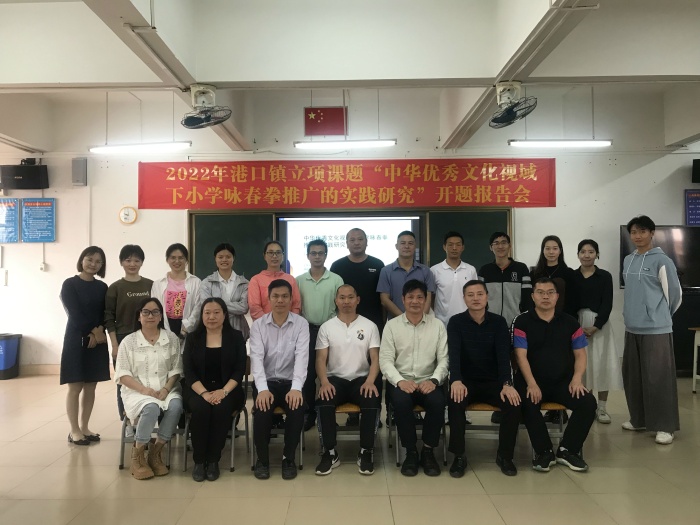 春回大地、草長鶯飛。在春意盎然的四月里,港口鎮西街小學迎來了教研工作的一大喜事——港口鎮2022年立項課題“中華優秀文化視域下小學詠春拳推廣的實踐研究”如期開題了。4月6日上午,開題報告論證會在西街小學多媒體室召開。出席本次論證會的專家有港口鎮教育和體育事務中心陳樹洪老師、港口鎮民主小學桂玉盛主任和港口鎮石特小學陳國文老師。會議由西街小學徐艷麗副校長主持,西街小學梁容根校長、課題組成員及體藝科組全體老師參加了會議。