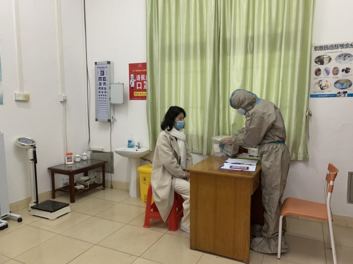 其次是進(jìn)行教室病例處置演練,模擬場景為:上課過程中出現(xiàn)發(fā)燒、咳嗽病例,且該病例最近到過高風(fēng)險地區(qū)。發(fā)現(xiàn)情況后,上課教師立即打電話給班主任和衛(wèi)生員說明情況。衛(wèi)生員穿隔離衣前往教室,并將發(fā)燒同學(xué)帶至隔離室問詢,確認(rèn)學(xué)生是否有中高風(fēng)險旅居史或接觸史,根據(jù)實際情況作出研判和處置。