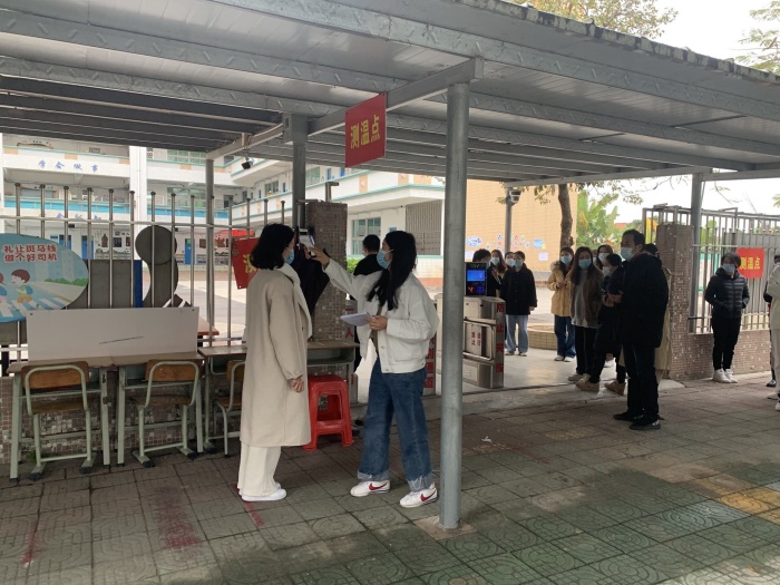 首先是進(jìn)行學(xué)生入校演練,模擬場景為學(xué)生開學(xué)返校。學(xué)生戴口罩間隔一米從校門外排隊,按照標(biāo)識,有序進(jìn)入。測溫員于入口處測溫,體溫正常,資料交齊后入校。在測溫過程中,有1名同學(xué)體溫偏高,校衛(wèi)生員馬上將該同學(xué)帶至門口臨時隔離室處置。隔離室內(nèi),衛(wèi)生員再次用水銀體溫計測溫,并進(jìn)行健康問詢,確定無接觸史,后聯(lián)系行政綜合研判后處置,學(xué)生離開后,隔離室進(jìn)行全面消毒。