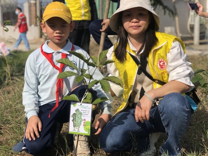 經過一番緊張勞動,新栽下的一棵棵樹苗挺立在春風里,待到來時日,這里將會是一道美麗的風景線。小樹苗種好后,孩子們給小樹苗掛上精心制作的紀念碑,“愛心樹”“成長樹”無邊寄托了孩子們純真的童心以及對未來的憧憬。