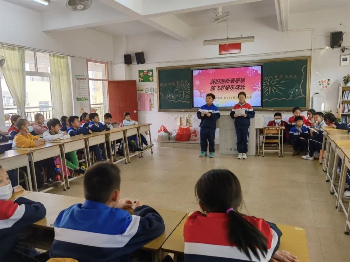 2021年12月31日下午,以班級為單位開展的“辭舊迎新表感恩 放飛夢想樂成長”主題班會活動正開展得如火如荼。各班正副班主任充分發(fā)揮聰明才智,圍繞主題,組織了豐富多彩的辭舊迎新主題活動。或講述元旦的來歷,或暢談新年的祝愿,或組織驚喜禮物交換會,或用畫筆畫下新年美好祝福,或由班級學(xué)生自己設(shè)計(jì)、組織新年聯(lián)歡會,學(xué)生熱情高漲,積極參與,充分發(fā)揮自己的特長,武術(shù)、朗誦、小品、游戲等節(jié)目一一亮相,現(xiàn)場精彩紛呈,笑聲連連。