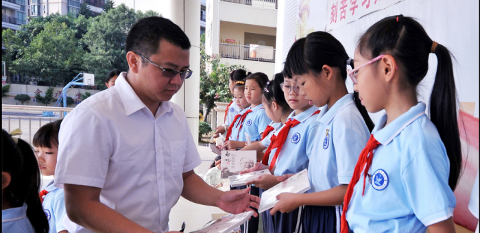 秀麗端莊的語文教師組聲情并茂地朗誦了詩歌《中國話》。吳高欣主任鏗鏘有力地宣讀了推普周倡議書。在儀式的最后,校領導向各班贈送優秀傳統文化讀本。孩子們手上的書籍,既是傳承,也是希望。啟動儀式的系列活動使整個校園都沉浸在推普周的氛圍中,起到了很好的宣傳、教育、熏染效果。