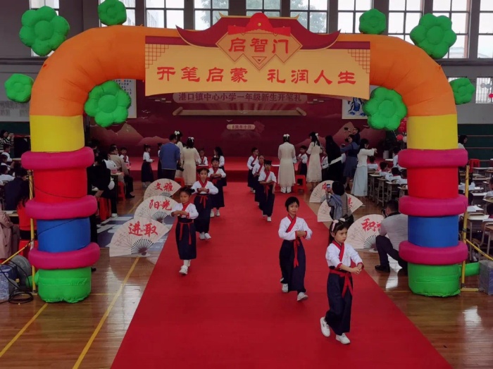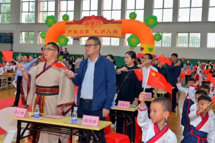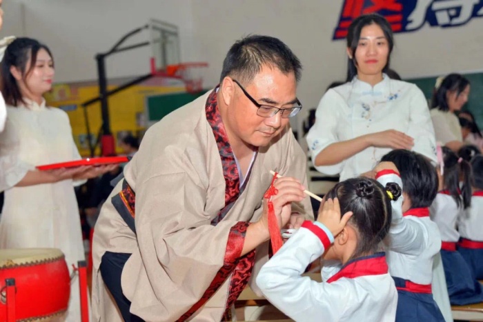 孩子們身穿漢服,在老師的帶領下洗凈雙手,再拱手穿越啟智門。行大禮前,凈手以凈其心,寓意著孩子們在成長過程中洗去浮躁、稚氣、留下睿智與儒雅。拱手穿越啟智門,象征著孩子們從今啟智,學習尚禮、立志“博學篤志,切問而近思,做有理想之人,有德性之人,有文化之人”。