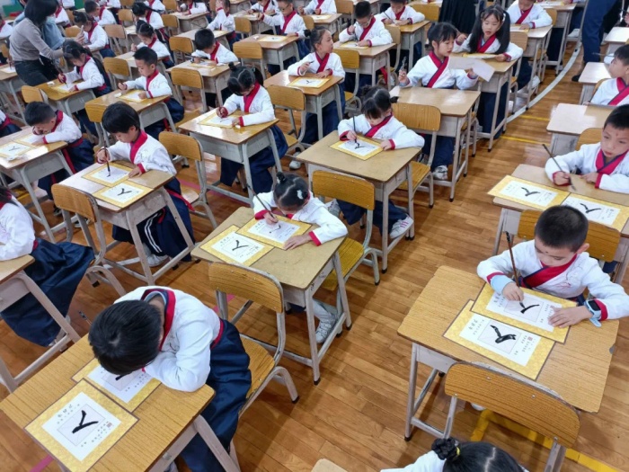 人字,一撇一捺,中正平和。孩子們在肖煒林老師的示范中,以一個人字開筆,寓意著在人生的啟蒙階段學會做人,像“人”字那樣頂天立地,像人字那樣堂堂正正!