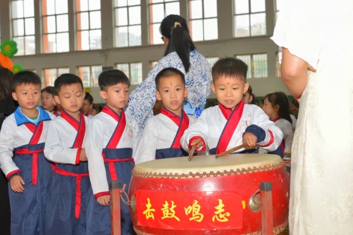“鳴”通“明”,“鳴志”即“明志”,擊鼓的聲音越響,聲音傳得越遠,說明志向就越遠大。陳小娟老師代表老師們發言,殷切希望孩子們從小要立下遠大理想,做一個有責任心和懂感恩的人!在陳老師的帶領下,學子們心懷理想,莊嚴而神圣地擊鼓鳴志。學子們個個精神飽滿,意氣風發。從此告別蒙昧,開始學習做人、學習做事,學習文化與知識。