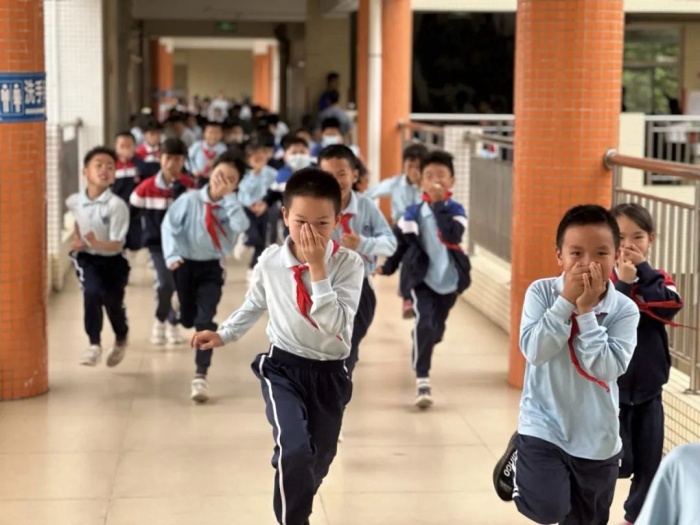 22日上午,防空警報響徹校園,3月份的安全疏散演練正式開始。各班學生在老師的指揮下,彎著腰,用手或小毛巾捂住口鼻,快速而有序地按預定疏散路線,從教室疏散到學校的操場上。兩分鐘不到,全體師生已迅速地撤離到安全地帶。各班到達操場后迅速報數并上報本班人員情況。