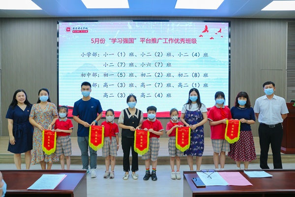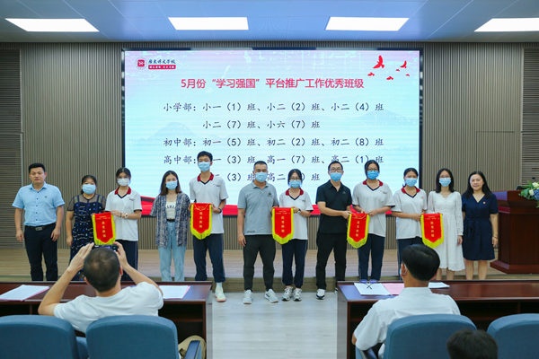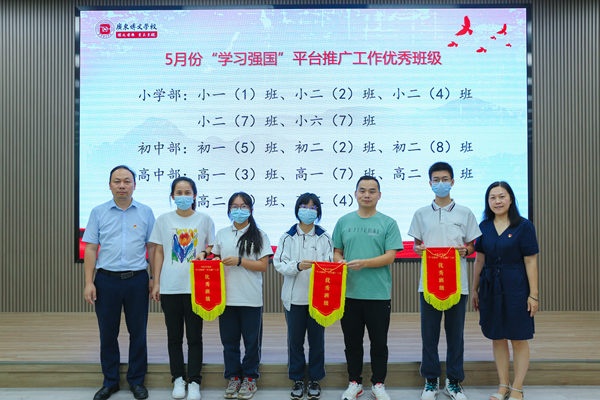 會議伊始由廣東博文學(xué)校黨支部副書記李敏同志宣讀 《中山市廣東博文學(xué)校“學(xué)習(xí)強(qiáng)國”學(xué)習(xí)獎(jiǎng)勵(lì)辦法》。隨后廣東博文學(xué)校黨支部副書記李敏同志、副校長任德利同志、初中部校長湯勇同志、小學(xué)部校長徐曙同志分別為5月份“學(xué)習(xí)強(qiáng)國”平臺推廣工作優(yōu)秀班級頒發(fā)流動(dòng)紅旗。