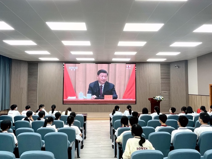 越百年櫛風沐雨,綻芳華乘風破浪。今年是中國共產主義青年團成立100周年,慶祝大會在北京人民大會堂隆重舉行。中共中央總書記、國家主席、中央軍委主席習近平出席大會并發表重要講話。廣東博文學校初、高中部共同組織團員以及入團積極分子在綜合樓407觀看本次建團100周年慶祝大會的現場直播。