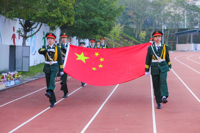 大會(huì)第一項(xiàng):升旗儀式。莊嚴(yán)的儀仗隊(duì)邁著鏗鏘有力的步伐,護(hù)送國旗緩緩走向主席臺(tái),現(xiàn)場(chǎng)全體師生奏唱國歌,群情振奮。