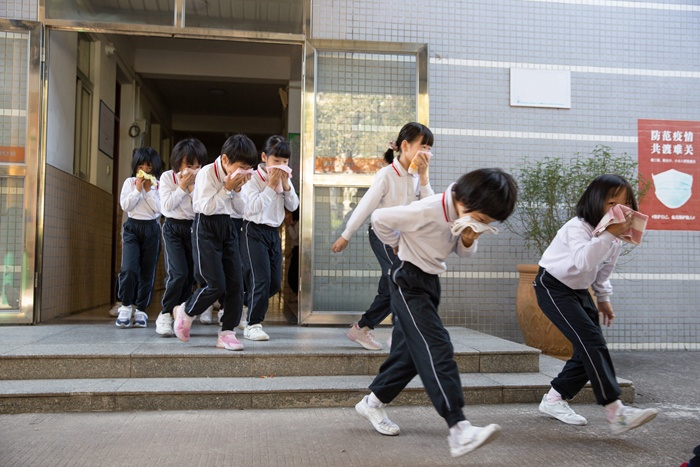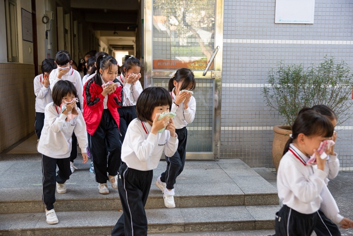 當火警鈴聲響起,學生們迅速打濕毛巾捂住口鼻,彎著腰從宿舍快速撤離到室外的空曠場地,生活老師清點班級人數,上報棟長。整個疏散演練過程快而不亂,險而不驚。生活老師沉著指揮,樓梯間、安全出口處均有保育員指引學生逃生路線,全部學生撤離出宿舍區僅用時四分鐘。最后,生活部全體師生背誦消防兒歌:疏散快無傷害;跑到危險區域外;彎身體,捂口鼻;最近出口速撤離;防擁擠,防踩踏;組織有效全不怕;不貪財,不戀物;絕不返回危險處。